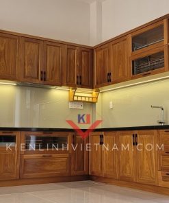 Tủ Bếp gỗ Tự Nhiên Tân Cổ Điển chữ L, bếp Gỗ Cẩm Vàng