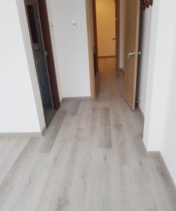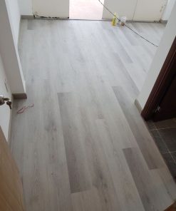 _ Bước 4: hoàn thiện thi công: sau khi đã lắp đặt toàn bộ ván sàn, thợ sẽ tiến hành đóng phào chân tường và nẹp ở cửa ra vào, ngạch đá nhà vệ sinh, tùy vào cao độ của tấm đá ngăn cách mà sử dụng nẹp kết thúc hoặc nẹp T, đối với các phòng đã đóng len gạch thì không thể đóng phào chân tường mà chỉ có thể sử dụng nẹp kết thúc. Cuối cùng là thợ tiến hành bắn silicon xung quanh, dọn vệ sinh, kiểm tra lại có lỗi trong quá trình lắp đặt và xử lý trước khi bàn giao công trình.
