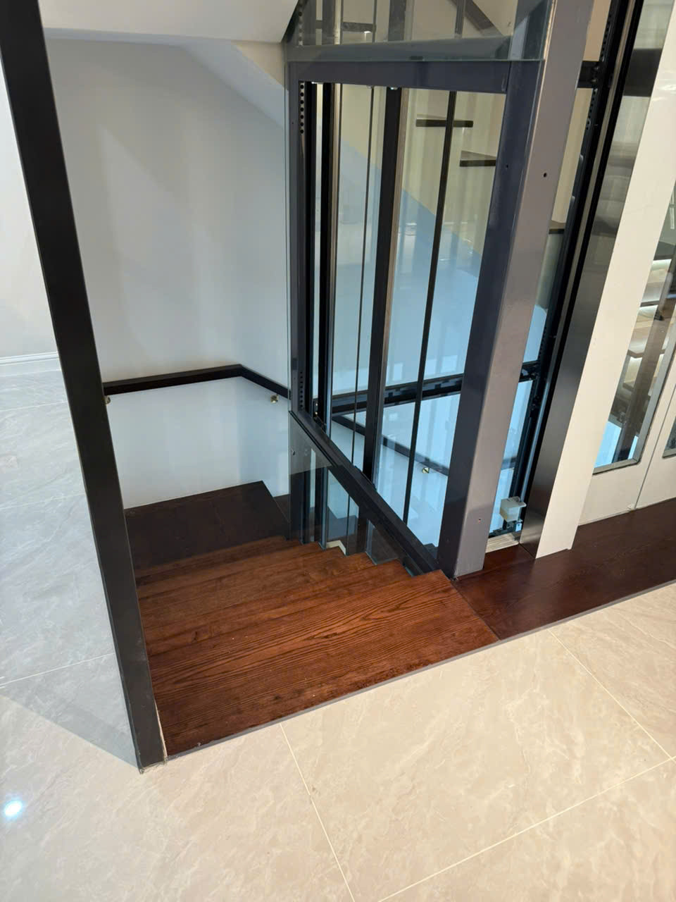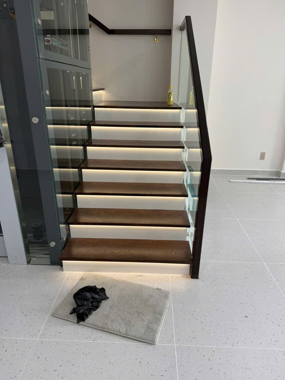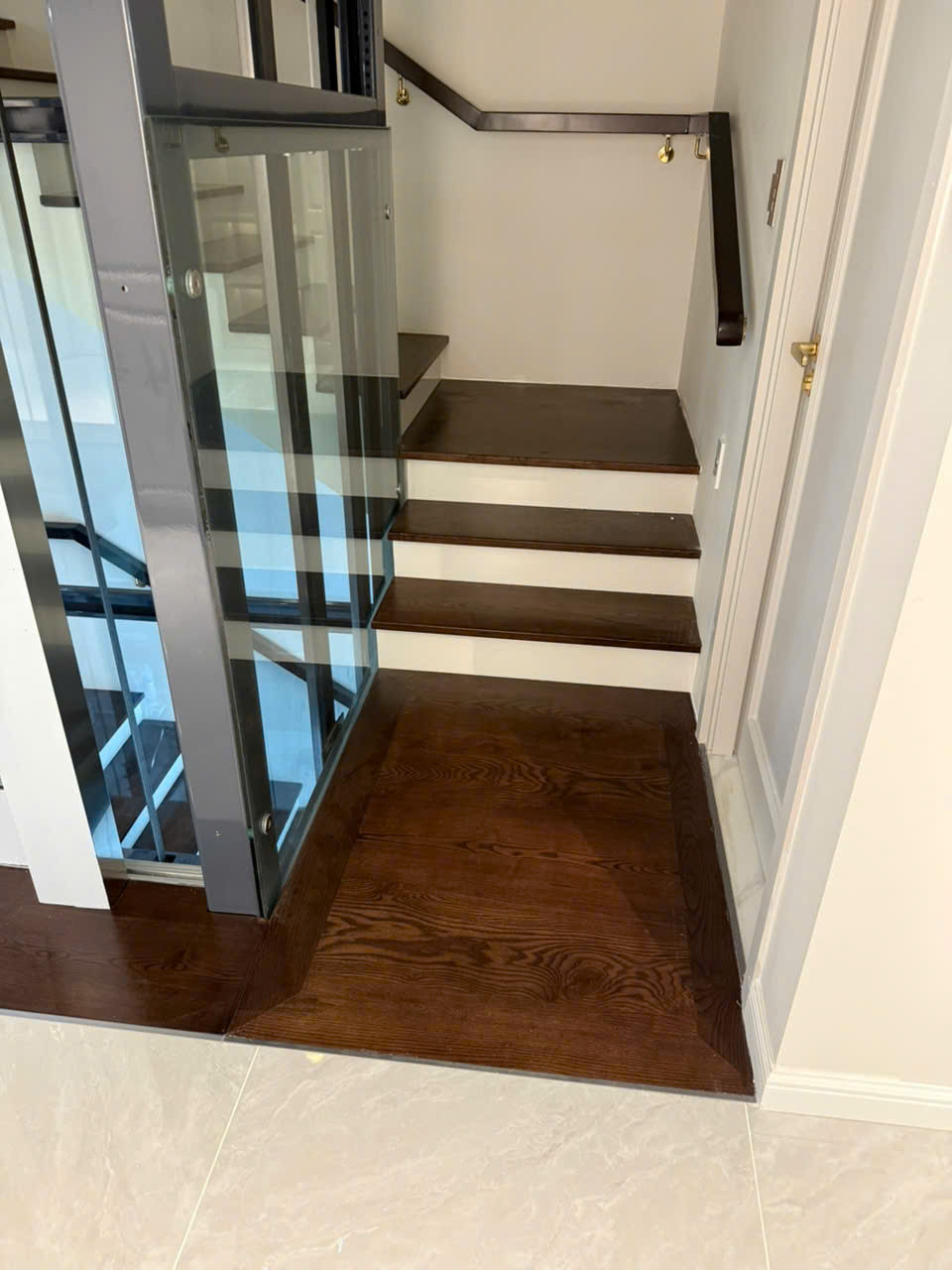 Cầu thang gỗ Sồi tự nhiên bố trí liền kề thang máy, thiết kế hài hòa – tiện nghi và sang trọng Thiết kế cầu thang gỗ Sồi kết hợp đèn LED tinh tế – điểm nhấn nghệ thuật cho ngôi nhà bạn